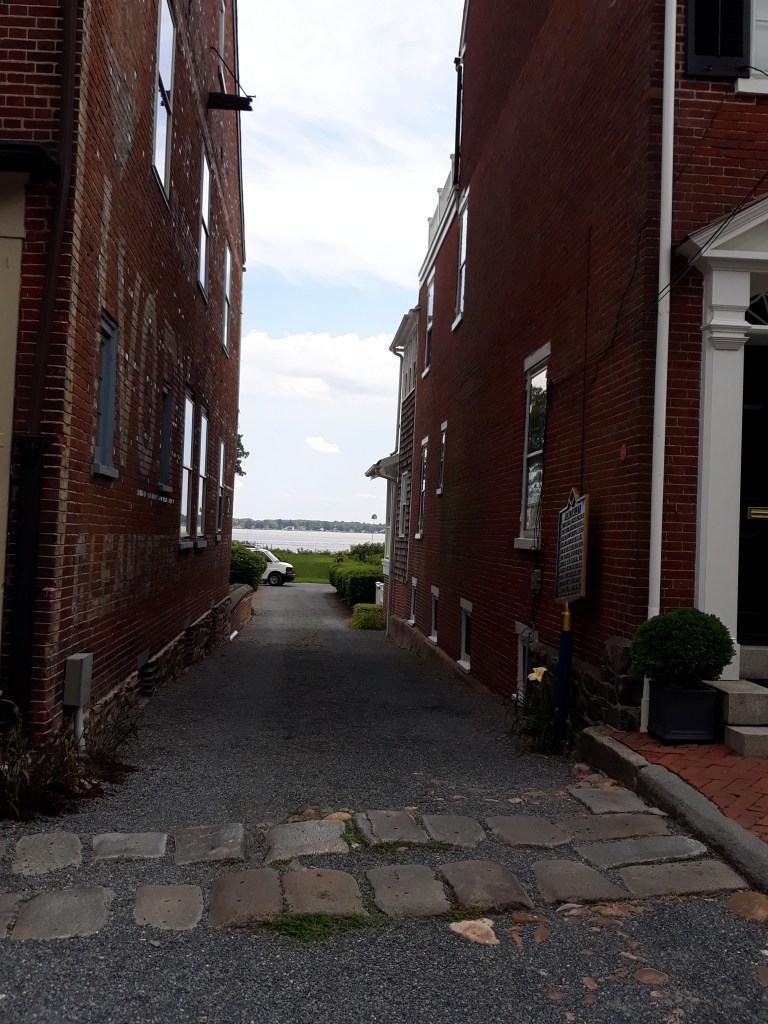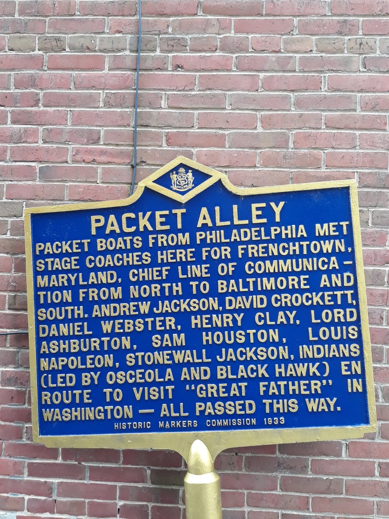 You’ll find Packet Alley at a very old historic town at New Castle, Delaware. And when you walk around, history will be brought to life. There are many historic buildings and streets to traverse when visiting this page of history. William Penn landed there near 400 years ago. Some of the streets still reveal the original cobblestones lining the sides where today cars are parked. And after walking down the quaint street occupied by red-bricked homes, we stopped at Packet Alley, and the entrance to what was once the port to the Delaware River. In Benjamin Franklin’s time, packets were vessels that carried mail between European ports and the colonies. He and his cousin, Timothy Folger, a Nantucket whaler, collaborated on charting the Gulf Stream. Franklin was puzzled as to why it took longer for a sailship to sail west to North America, compared to the length of journey from Philadelphia east to ports in the Kingdom of Ireland or France. James McIntire II, together with his father and sister Rebecca, sailed upon a schooner from Lewestown to New Castle following the shipwreck of Faithful Steward. We walked down this street and I stopped, staring at the sign below. Upon reading it, I looked around. It was as if I could see James McIntire I, Rebecca, and James II, departing the schooner, and walking up the alley for their journey to visit his cousin near Maytown, Pennsylvania, 236 years before.