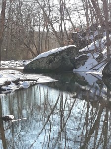 Around the corner from Camp Green Lane you turn onto Hausman Road. This picture was taken from a small bridge built over the Ridge Valley Creek. North of the Ridge, you are near the boundary of Salford and Marlborough Townships and have left the farmland of the Indian Valley behind. You pass through a much different environment with heavily wooded areas, narrow roads, some paved, some stoned, and many large boulders are strewn about, remnants of the ice age when these huge specimens descended from the north. Take a look at that huge boulder in the center of the picture. Nearly 275 years ago, I can see a family of Lenape sitting on the boulder – some bathing and if the creek is deep enough – maybe some young ones jumped off the boulder into the water. February 24, 2021