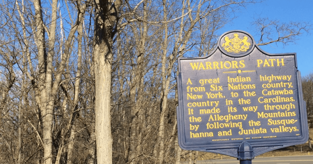 In my upcoming historical fiction novel there was cause to include a chapter about an ancient pathway through North America, including Pennsylvania. The Scots-Irish who migrated from Londonderry, in my novel, chose to settle in western PA, and they would have encountered, even used the Warrior’s Path. Part of the Pennsylvania Turnpike from somewhere near Carlisle to Pittsburgh may have been built over the Warrior’s Path.Some years ago, while visiting my nephew near Troy, PA, I drove west on Route 6 and stopped roadside for a break. I was looking at the sign – picture below, of the Warrior’s Path. Years later while driving through Phoenixville across the bridge over the Schuykill, I saw an identical sign for the path. For a moment we will divert from the purpose of the history of the Lenape since I inserted a segment from my new novel, and you will see that the path involves the Six Nations and the Shawnee.”A Shawnee word – Ath-ia-mi-owee – was used to reference the trails in the pathway – and the word meant “path of the armed ones.” The Warrior’s Path was built by wear and tear, the constant grinding of the earth’s vegetation to a level where animals and men used the route for travel. The pathway stretched outward in many directions and the system of trails existed for hundreds of years, well before Europeans explored continental North America. The athiamiowee was used extensively for war and hunting game because nomadic herds of buffalo and elk used the trails for migration. And so the Warrior’s Path could be a place of danger for the Lenape (Le-nah-pay), the Shawnee, or a tribe within the Six Nations.” I suggest to you, members of the IVHS, that there must have been branches of the Warrior’s Path running near or through the Indian Valley. It’s your turn – anyone know of any history? What can you add? For me, this is fascinating history. February 28, 2021